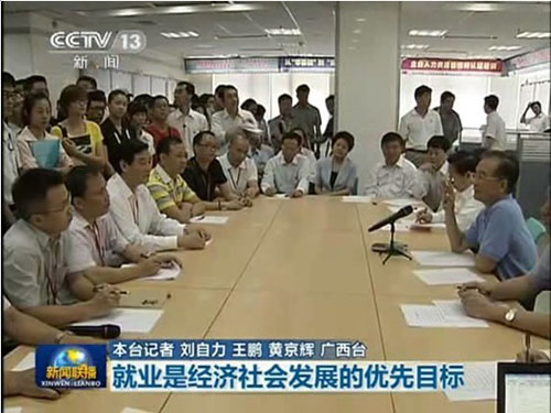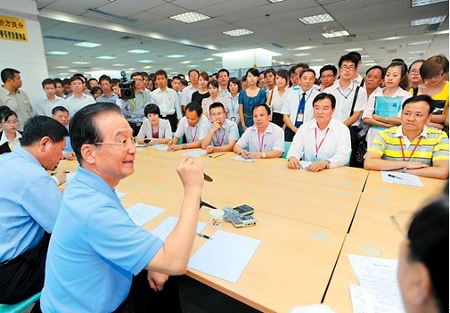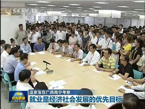 温家宝总理在座谈会上强调,就业是民生第一大事,解决就业就解决了年轻人实现理想抱负的问题,年轻人要吃得了苦,吃苦不叫苦,要从一线做起,要从基层做起。温总理的讲话,获得了在座人员的一片又一片的掌声。
