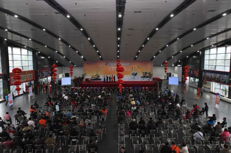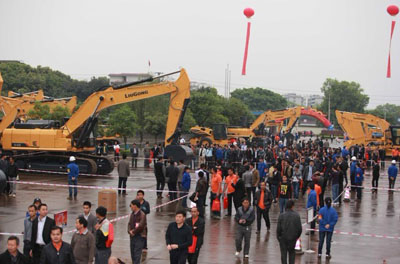 3月18日一大早,来自广西全区的300多位客户就从酒店出发,来到位于柳州拉堡镇的柳工挖掘机厂。厂里摆得井然有序的E系列挖掘机犹如一个个卫士在欢迎远方的客人到来。活动开始前,客户们都在各个挖掘机前参观,有的客户甚至亲自上阵,试起机子来。可惜天公不作美,下起了雨,但大雨也浇不息客户们的热情,有些客户还是冒着雨参观、试驾。