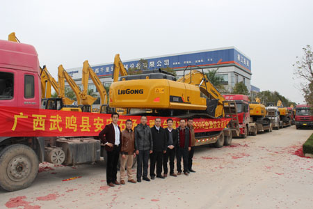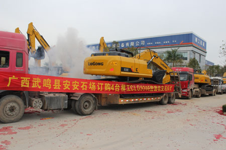 2014年2月8日,武鸣安安石场订购4台930E柳工挖掘机发车仪式在我公司总部隆重举行,屈东图总经理、叶飞副总经理、服务总监韦孟学等共同见证了这一历史时刻。